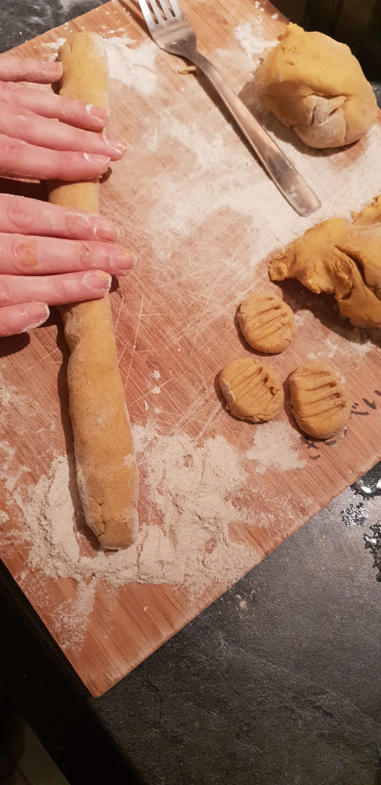 5) Diviser la pâte en 4 boules de taille égale. Fariner le plan de travail légèrement & avec chaque boule former des longs boudins d’environ 1 cm diamètre. Les fariner & les couper en tronçons de 1,5 à 2cm environ. Leur donner une forme de gnocchis en écrasant légérement le dessus à l’aide d’une fourchette.