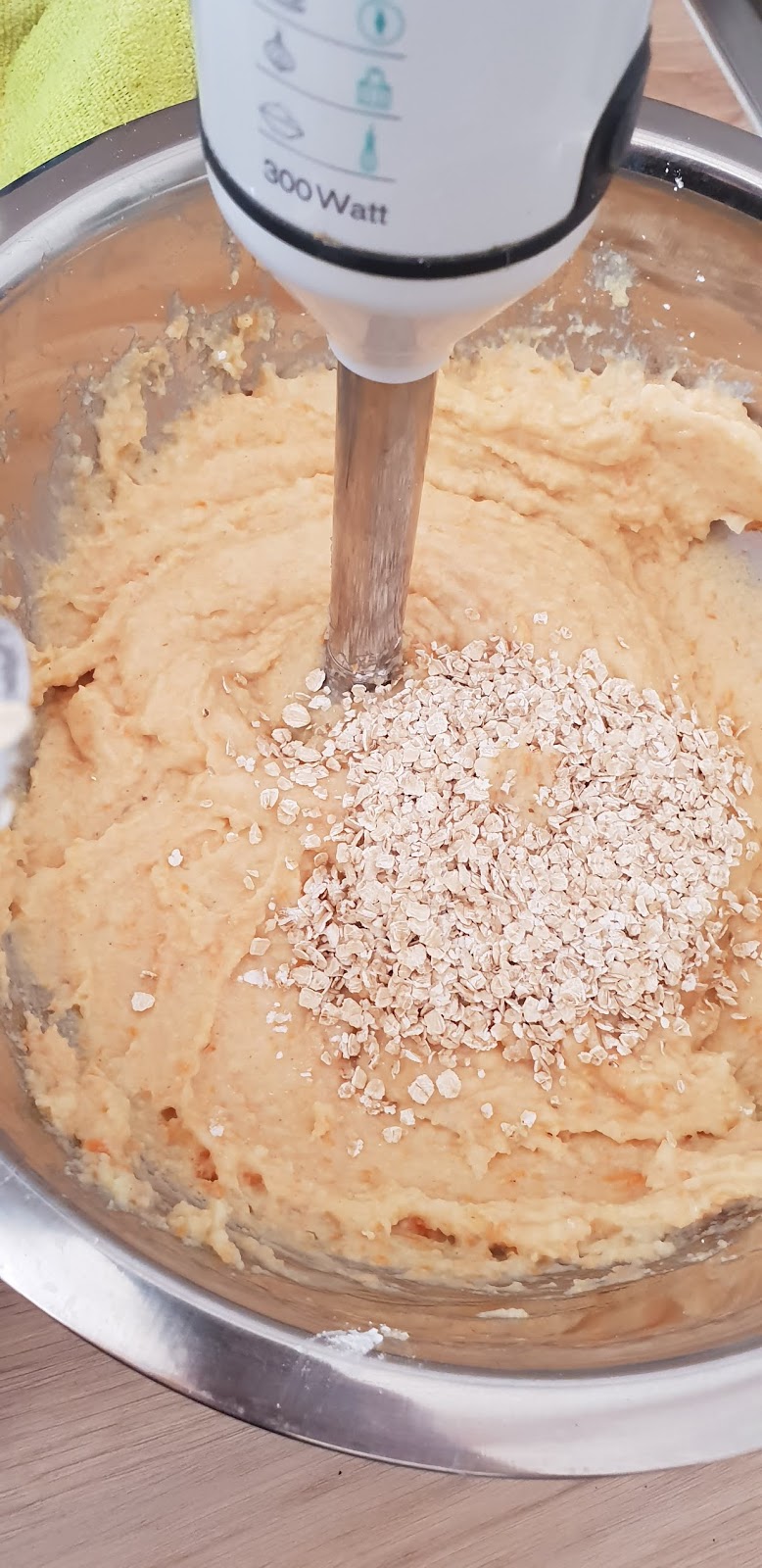 4. Rajoutez les flocons d’avoine, la fécule, la farine, l’oeuf entier, la pâte de curry, et le gingembre (optionnel).