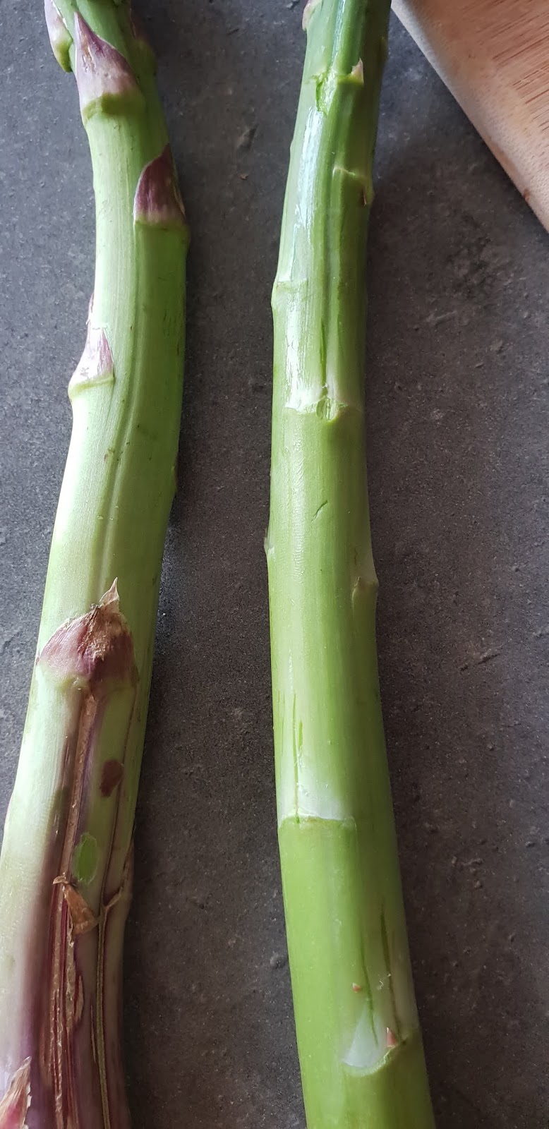 Écussonnez les asperges, c’est-à-dire : enlevez les petits triangles qu’il y a le long de l’asperge (les « écailles » rigides).