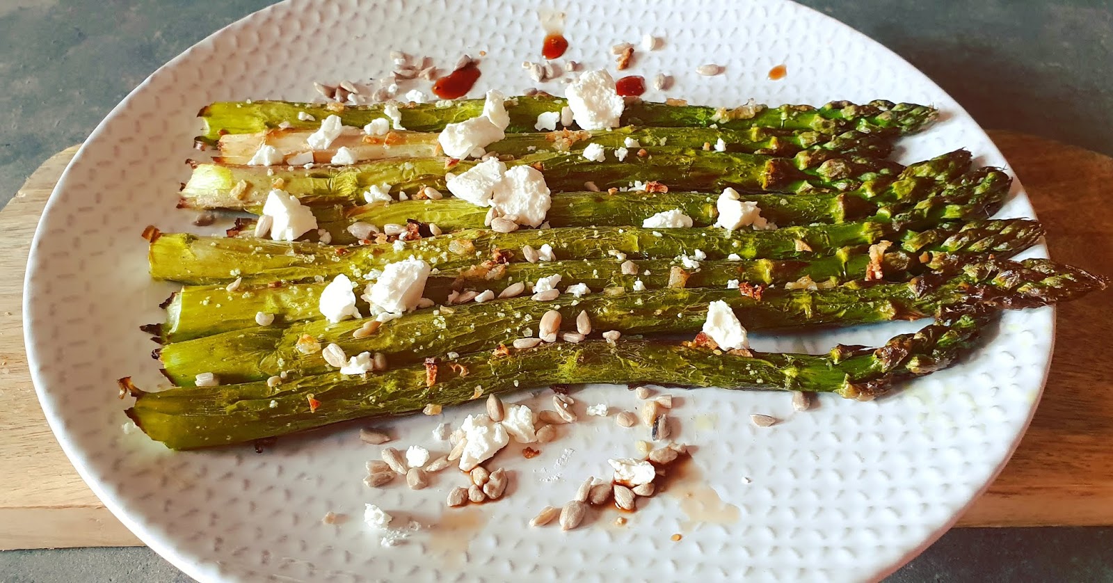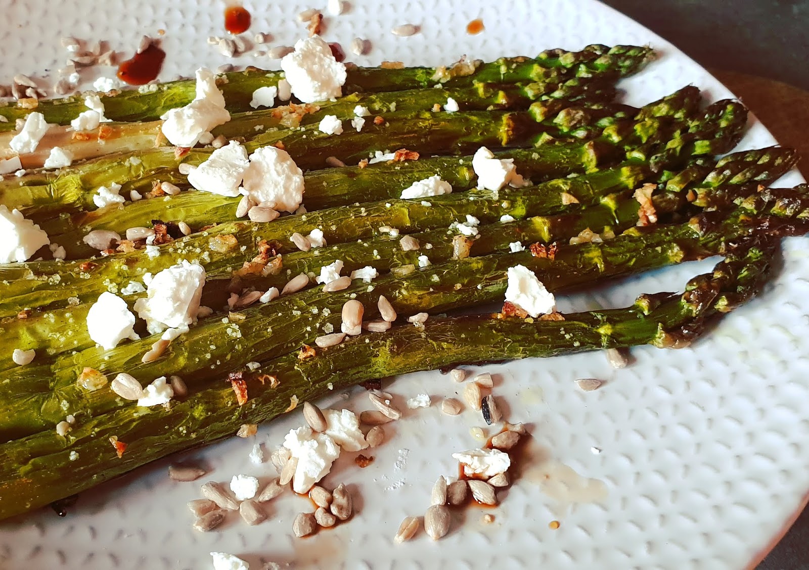 6. A la sortie du four, servez vos asperges avec la vinaigrette, les graines de chanvre et de tournesol. Parsemez de feta ou de copeaux de parmesan (ou levure maltée pour les vegan ou les intolérants au lactose ).
