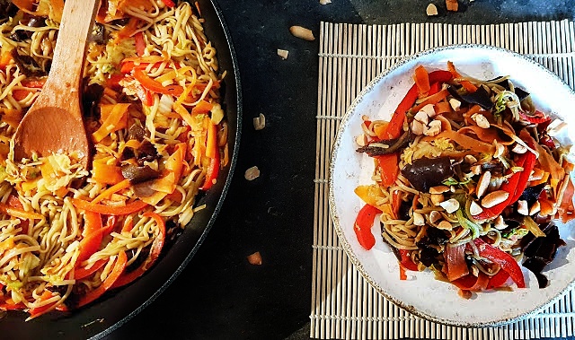 C’est donc un sauté de nouilles de riz et de légumes. Cuisson au wok, à feu vif, ce qui permet de garder les légumes croquants et conservant tous leurs bienfaits nutrionnels. On peut rajouter du tofu et des graines germées, je ne l’ai pas mit dans cette recette mais j’en rajoute parfois.