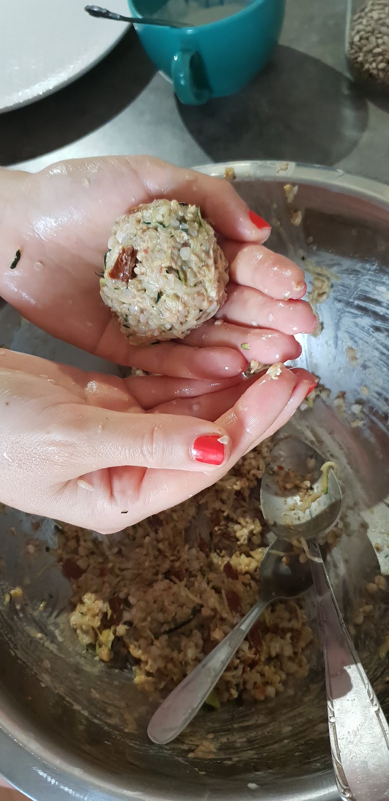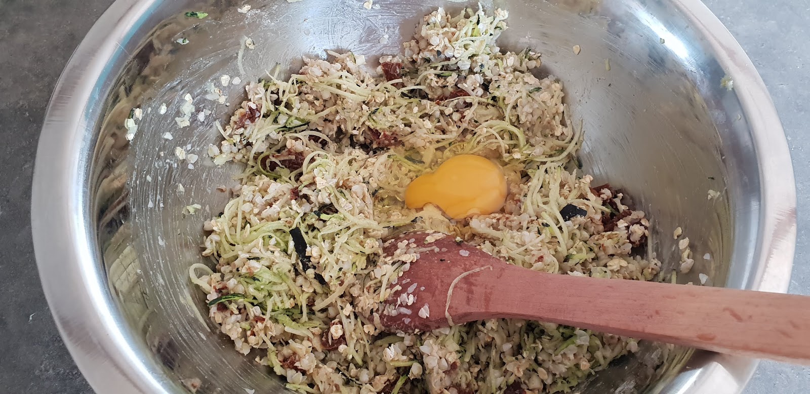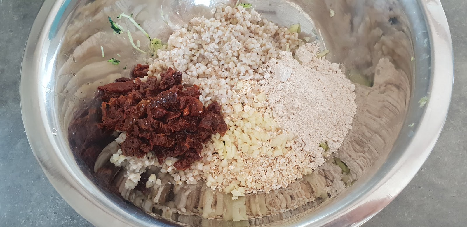 3. Rajoutez le sarrasin, les flocons, la farine, l’ail émincé, les tomates confites, l’œuf.
