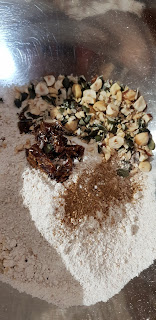 1) Dans un grand récipient, mélangez tous les ingrédients secs ensemble : flocons, farines, bicarbonate, levure, épices (pain d’épices, poivre de sichuan), noisettes et graines de courges hachées, dattes.