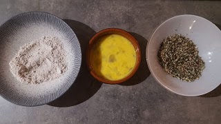 Préparez 3 bols différents : 1 avec la farine, 1 avec toutes les graines mixées, 1 avec l’œuf battu ou le lait végétal.