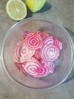 1/ Epluchez et coupez les betteraves crues en tranches très fines à l’aide d’une mandoline (plus les rondelles seront fines meilleur sera le rendu final). Faites de même pour la courgette (perso je laisse la peau car elle est bio/du jardin). Disposez le tout dans un plat.