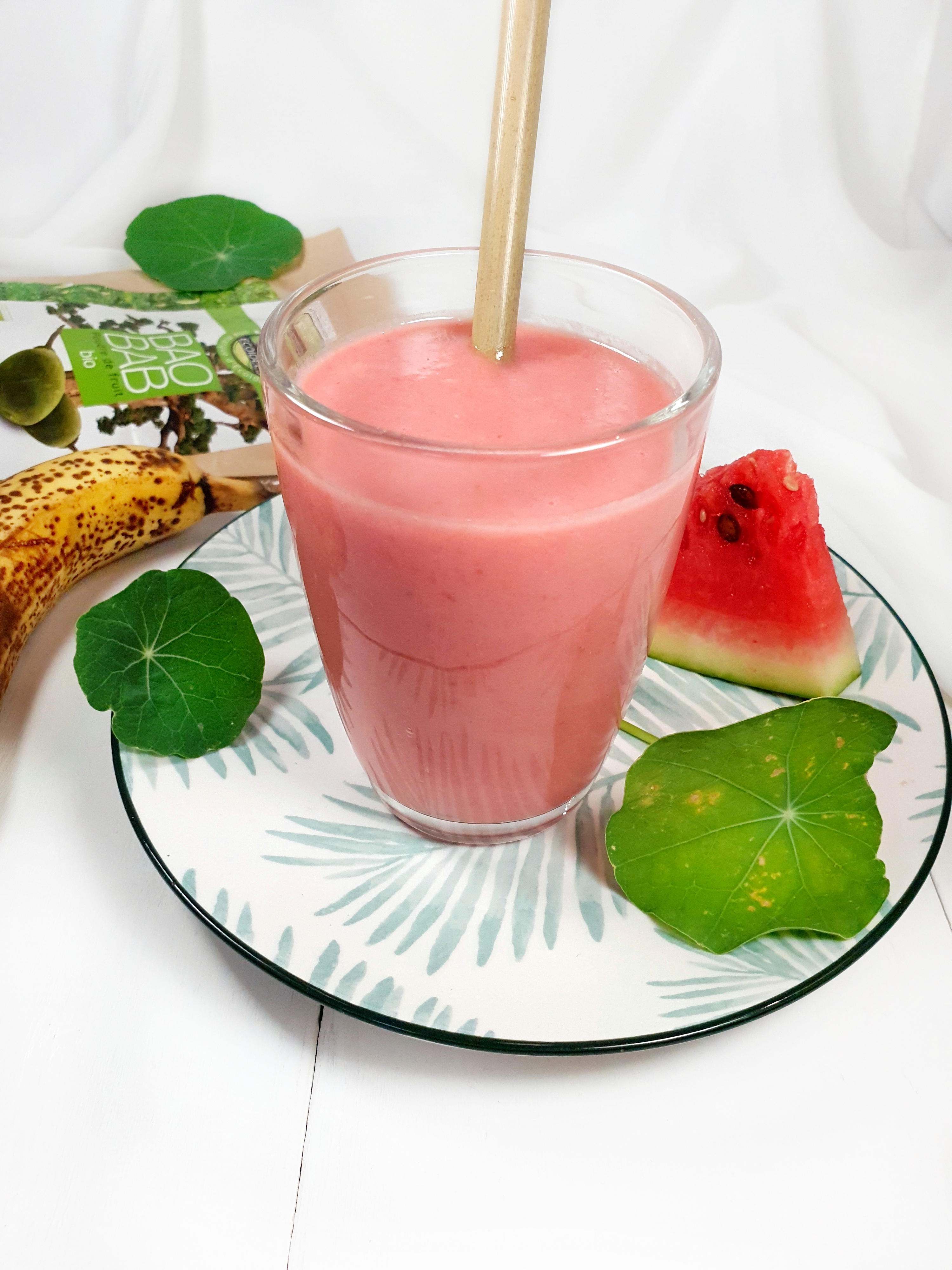 Un smoothie frais et onctueux grâce à l’association de ces 2 fruits : la douce banane et la rafraîchissante pastèque. Un pti peu de Skyr pour apporter encore du crémeux et l’ajout de mon ingrédient magique la POUDRE DE BAOBAB ! Un smoothie délicieux qui fait du bien à mon corps !