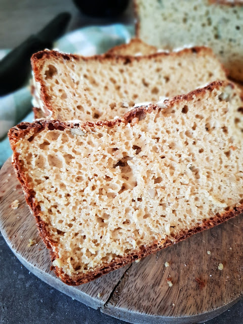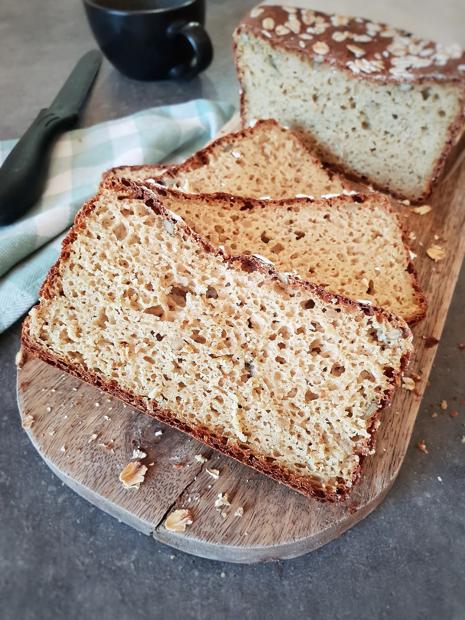 J’ai vraiment l’impression de manger un pain de campagne avec gluten ! La mie est aérée, pas humide du tout et son goût subtil s’accompagne aussi bien avec du salé que du sucré. Idéal pour tous les repas de la journée : petit-déj, brunch, déjeuner, dîner (le souper 😉 ), goûter …