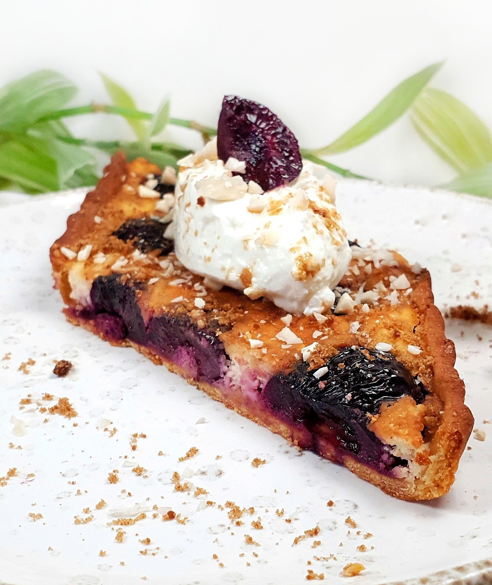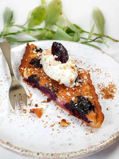 Laissez refroidir, personnellement je sers ma part de tarte avec 1 càs de skyr, je saupoudre d’éclats d’amandes ou amandes effilées + parfois un filet de sirop non raffiné ou miel.