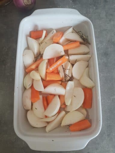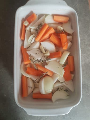 Eplucher les oignons, les couper en 6 quartiers. Eplucher les gousses d’ail & les couper en 2 ou en 4 selon leur taille (perso, j’adore les gros morceaux d’ail cuits)