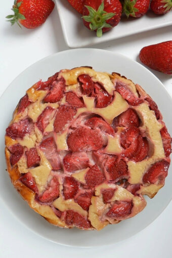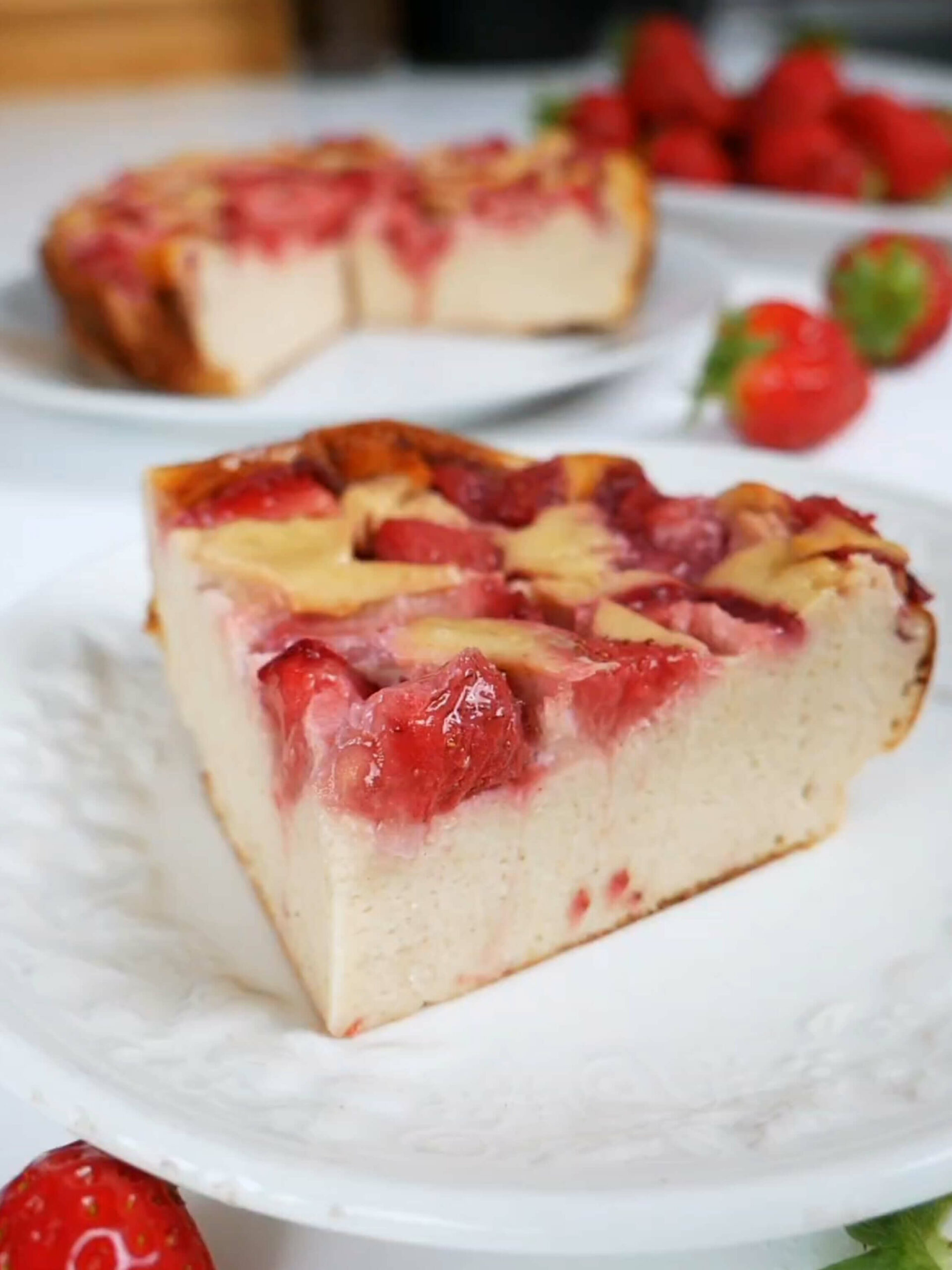 Un délicieux gâteau à la texture entre le flan et le clafoutis, bien frais, aux fraises ! Un dessert également meilleur pour ta ligne et ta santé puisqu’il est sain, sans ingrédients raffinés, ig bas, allégé en sucre et protéiné.